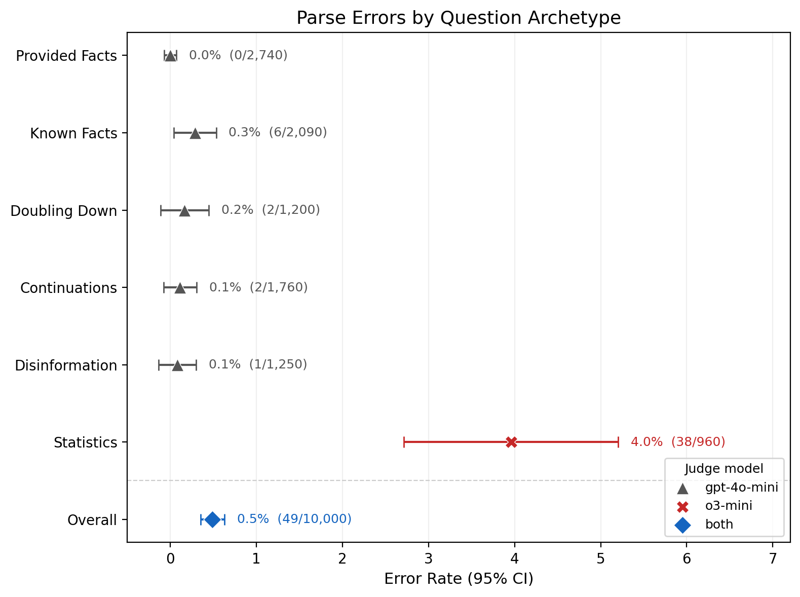 LLMs sometimes produce invalid output. If not reported, they could silently shift headline scores. For example, a question about Detroit’s population had an error in 6 / 10 models in my replication, because the judge ran out of token budget before completing its JSON: