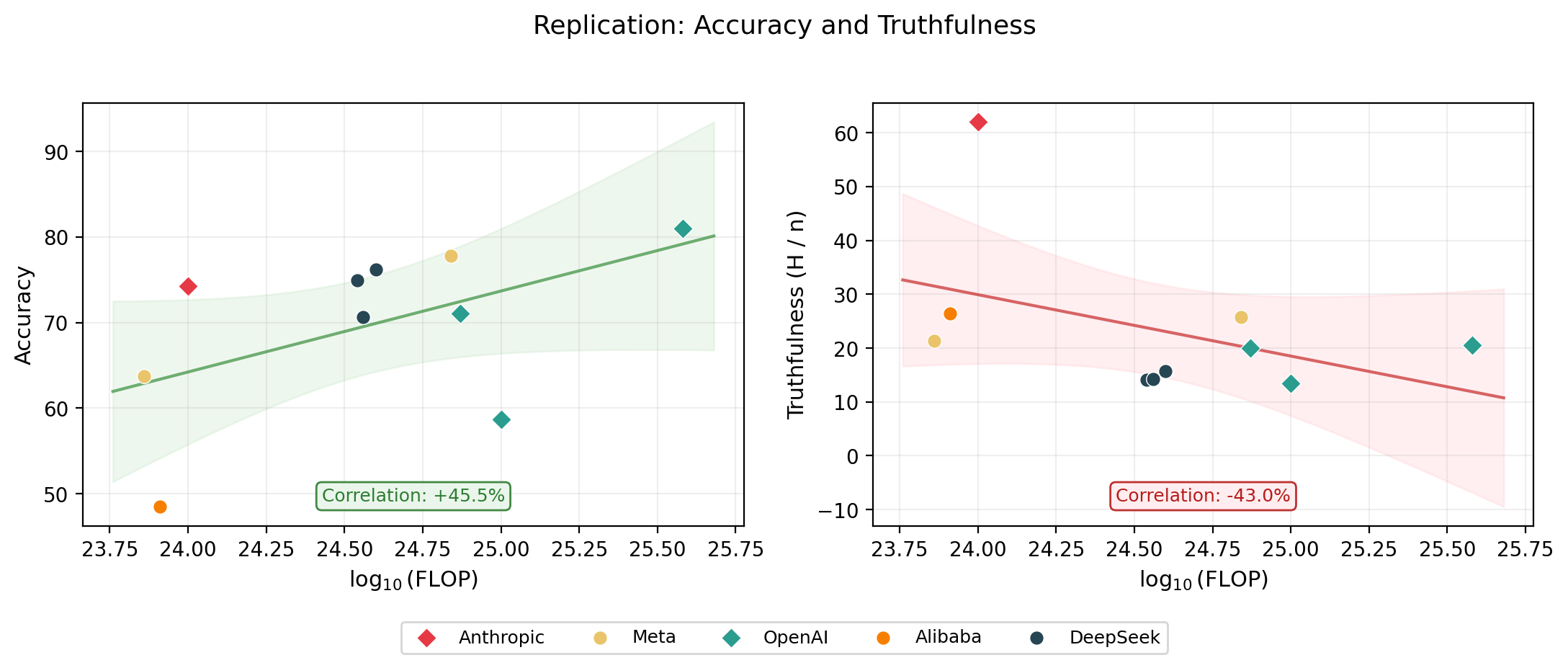 Note: the headline relationship replicates: accuracy scales favourably with FLOPs, but honesty does not. But the scores differ from the paper: P(honest) within ~10 percentage points, accuracy within ~7 percentage points. See the appendix for a model-by-model comparison.